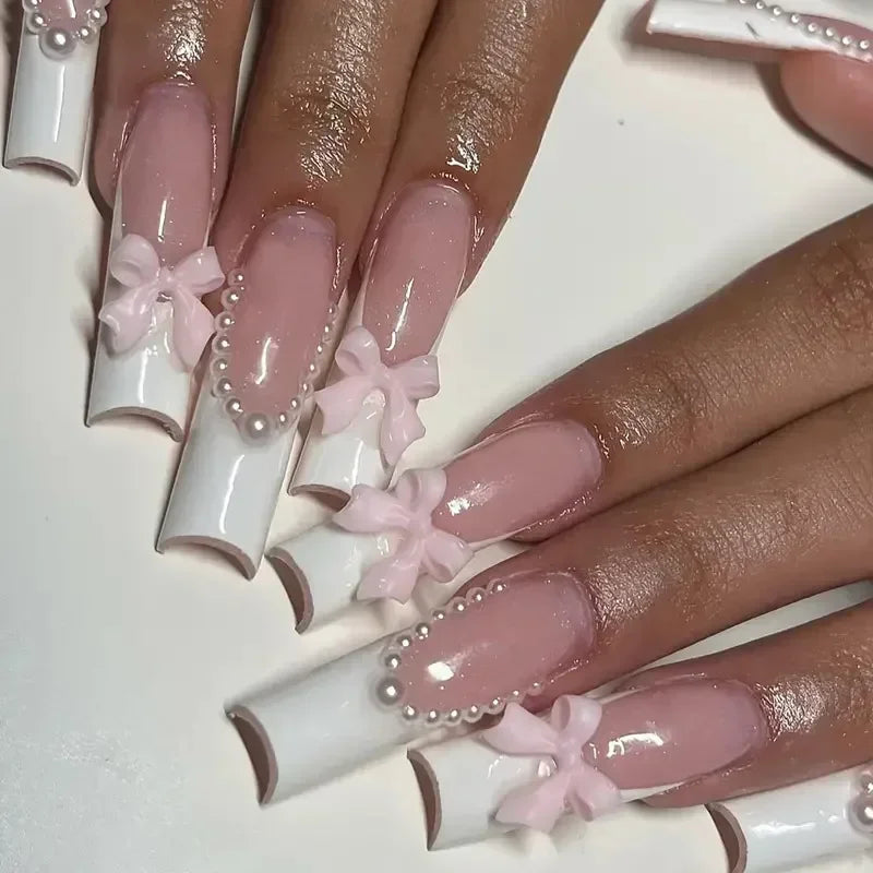 24Pcs Pink Long Ballet Coffin False Nails Butterfly Flower